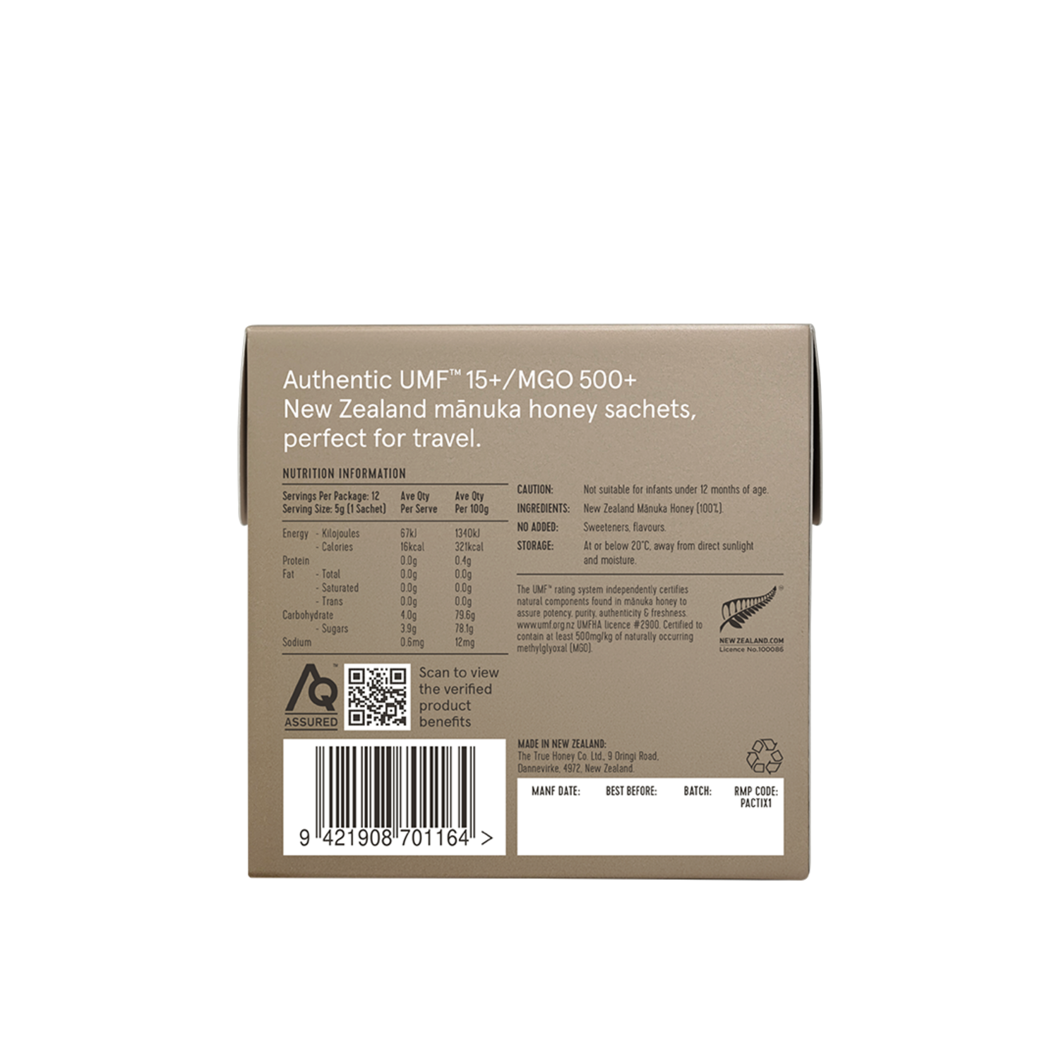 These sachets are produced and packed in New Zealand with mānuka honey sourced from hives in remote locations of New Zealand.